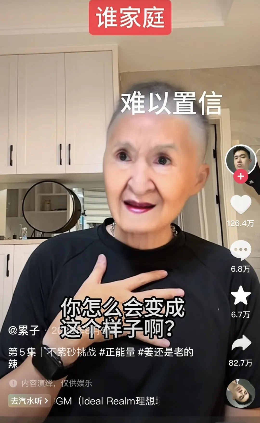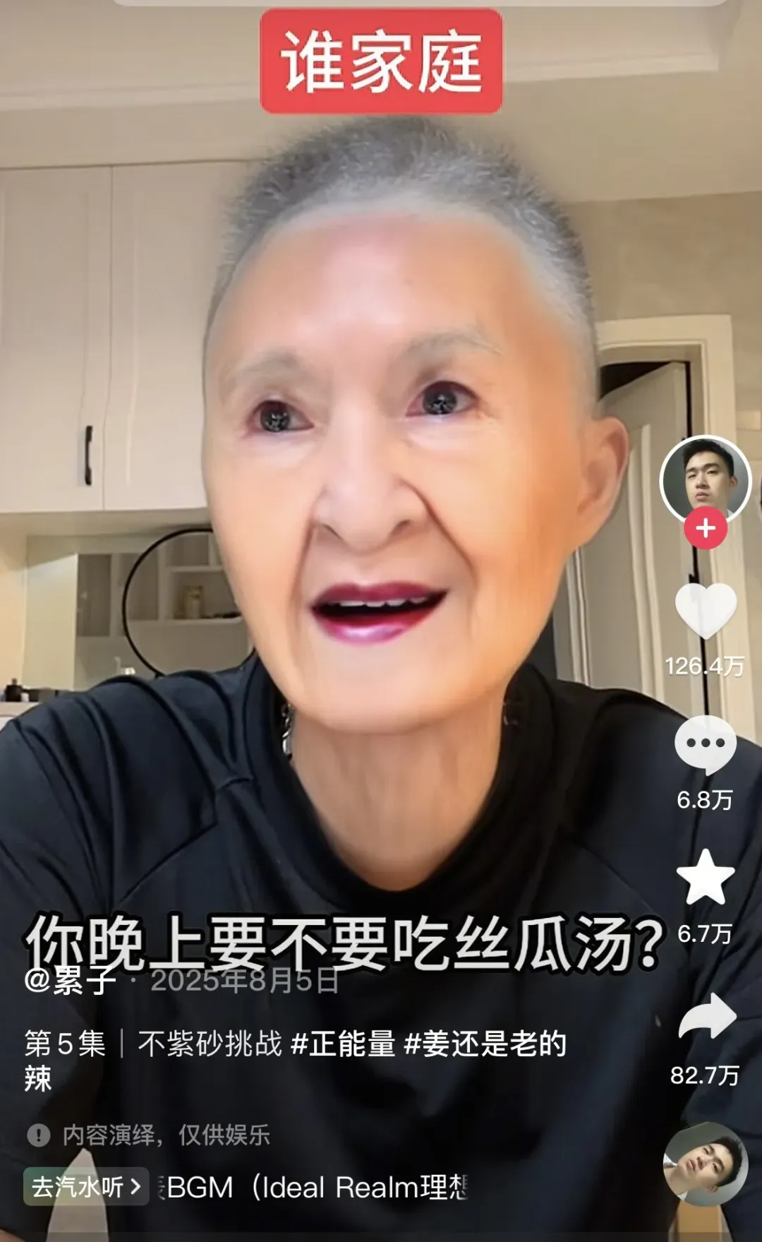 累子的视频往往捕捉日常的琐碎片段,多围绕“长辈的爱让人窒息但好像又无法反驳”展开。比如他演绎的“丝瓜传”系列,奶奶的语言看似温柔,实际内容却像“鬼打墙”一样,自说自话,根本不在乎累子的意愿。